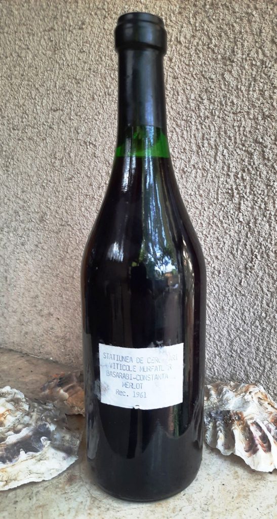 Cealaltă „ființă” este mai tânără. Dăm citire etichetei bătute la mașina de scris: „Stațiunea de Cercetări/ Viticole Murfatlar/ Basarabi-Constanța/ Merlot/ Rec. 1961”.